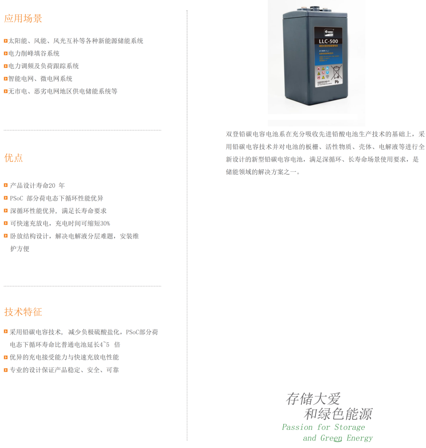 采用铅碳电容专利技术, 减少负极硫酸盐化,PSoC部分荷电态下循环寿命比普通电池延长4~5 倍