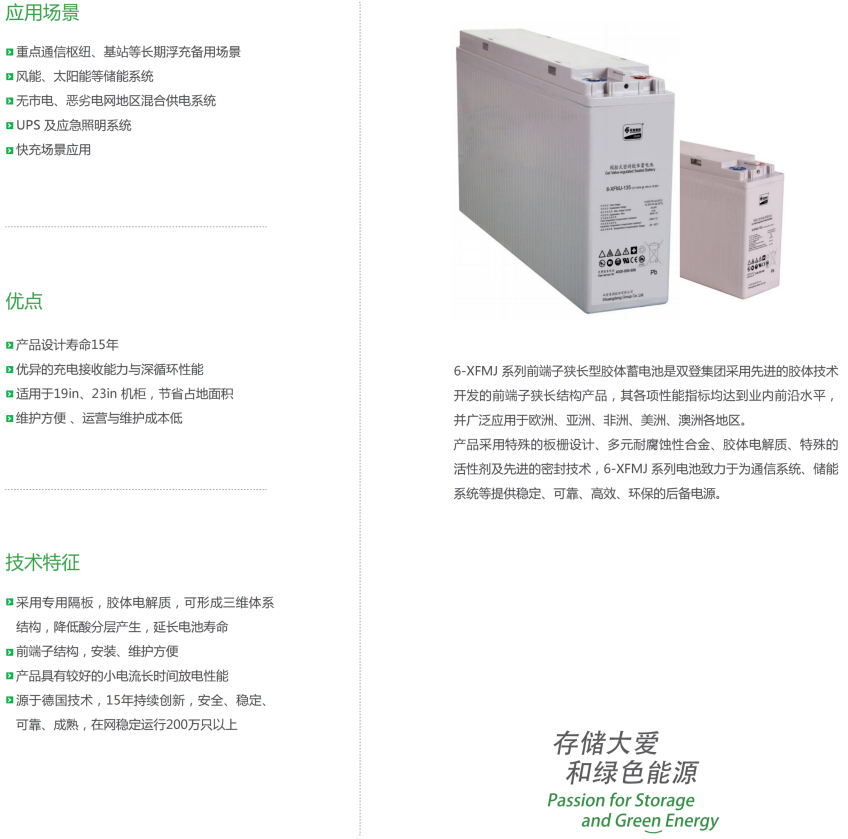 产品采用特殊的板栅设计、多元耐腐蚀性合金、胶体电解质、特有的活性剂及先进的密封技术,6-XFMJ 系列电池致力于为通信系统、储能系统等提供稳定、可靠、高效、环保的后备电源。