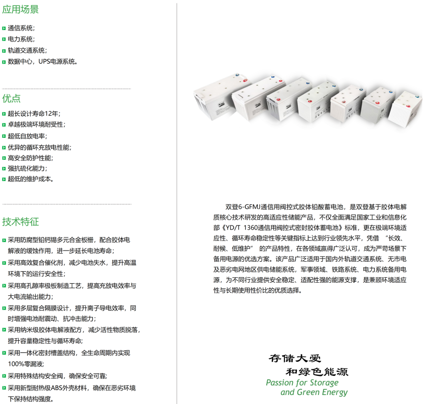 采用防腐型铅钙锡多元合金板栅,配合胶体电解液的缓蚀作用,进一步延长电池寿命;