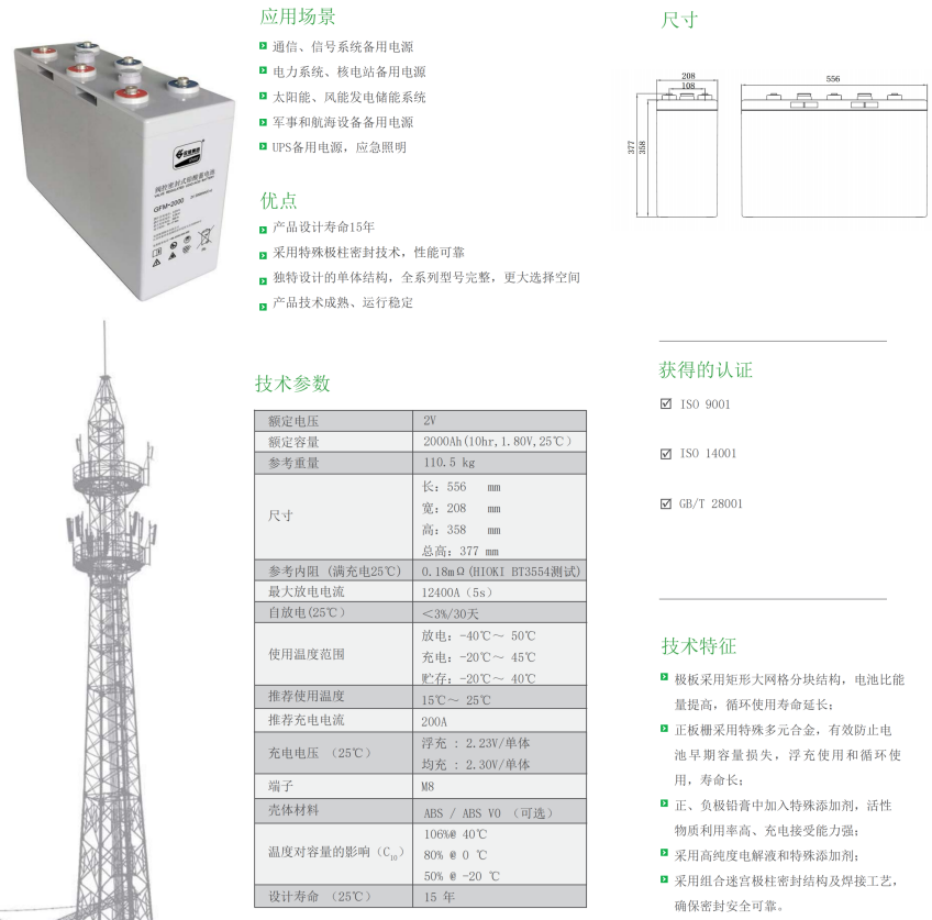 正板栅采用特殊多元合金,有效的防止了电池早期容量损失,浮充使用和循环使用,寿命长