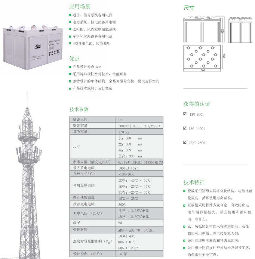 正板栅采用特殊多元合金,有效的防止了电池早期容量损失,浮充使用和循环使用,寿命长