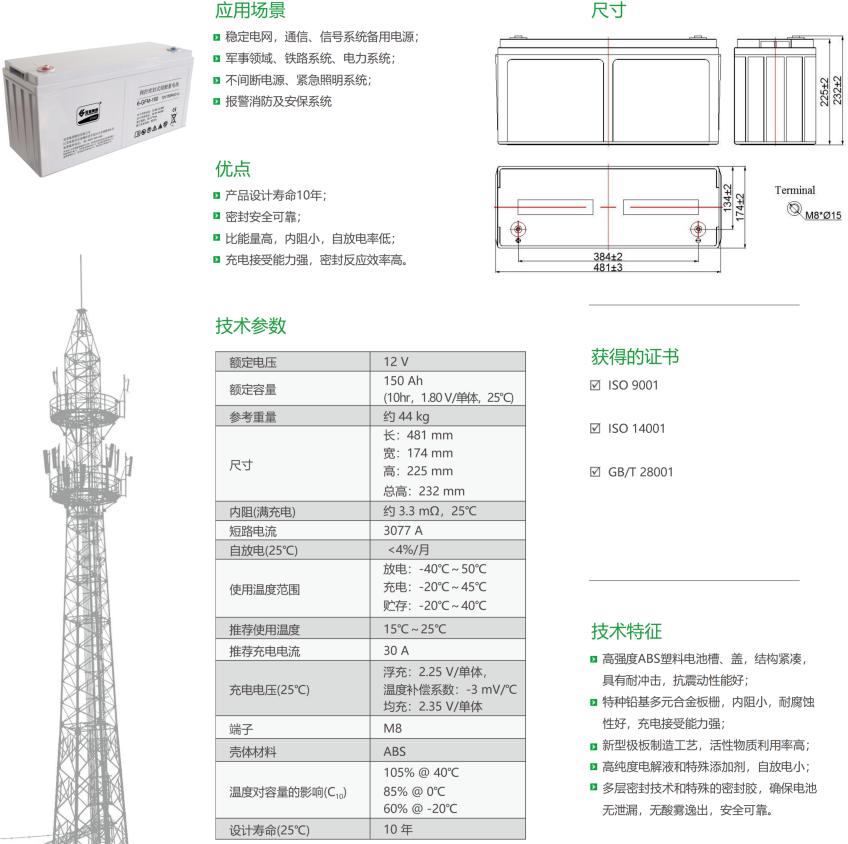 采用特种铅基多元合金板栅,具备内阻小、耐腐蚀性能强且充电接受能力强;