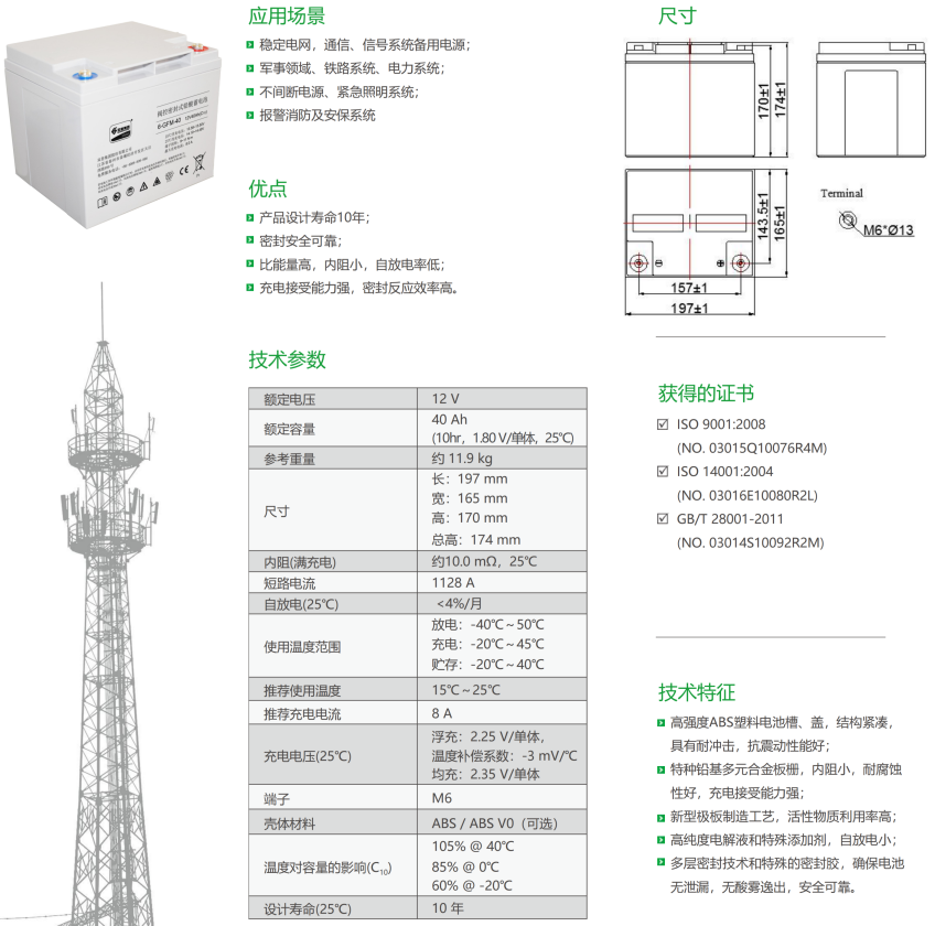 采用特种铅基多元合金板栅,具备内阻小、耐腐蚀性能强且充电接受能力强;