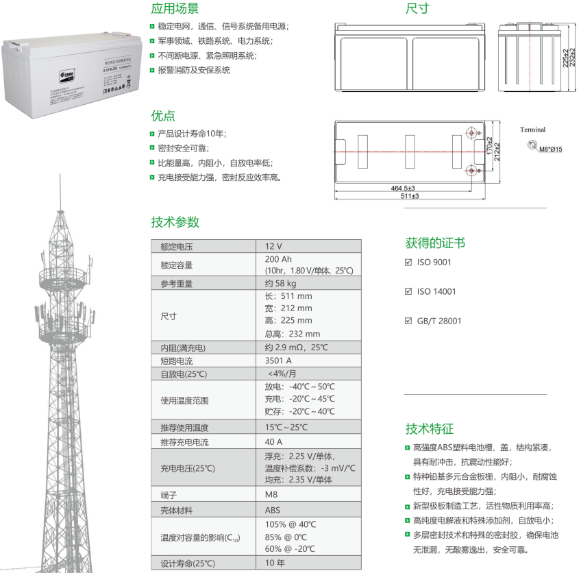 采用特种铅基多元合金板栅,具备内阻小、耐腐蚀性能强且充电接受能力强;